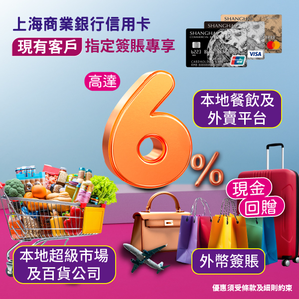 由即日起至2026年6月30日,現有客戶憑指定#上商 信用卡,成功登記及每月累積零售簽賬滿HK$3,000,指定簽賬類別專享高達6%現金回贈。指定簽賬類別包括: