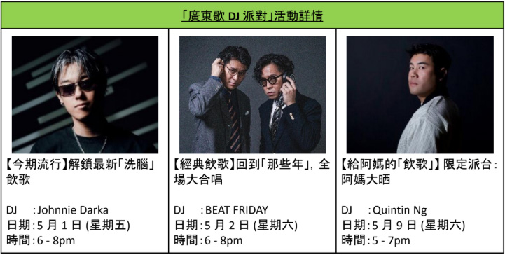 亮點一:【全城必玩】一連三場主題廣東歌 DJ 派對