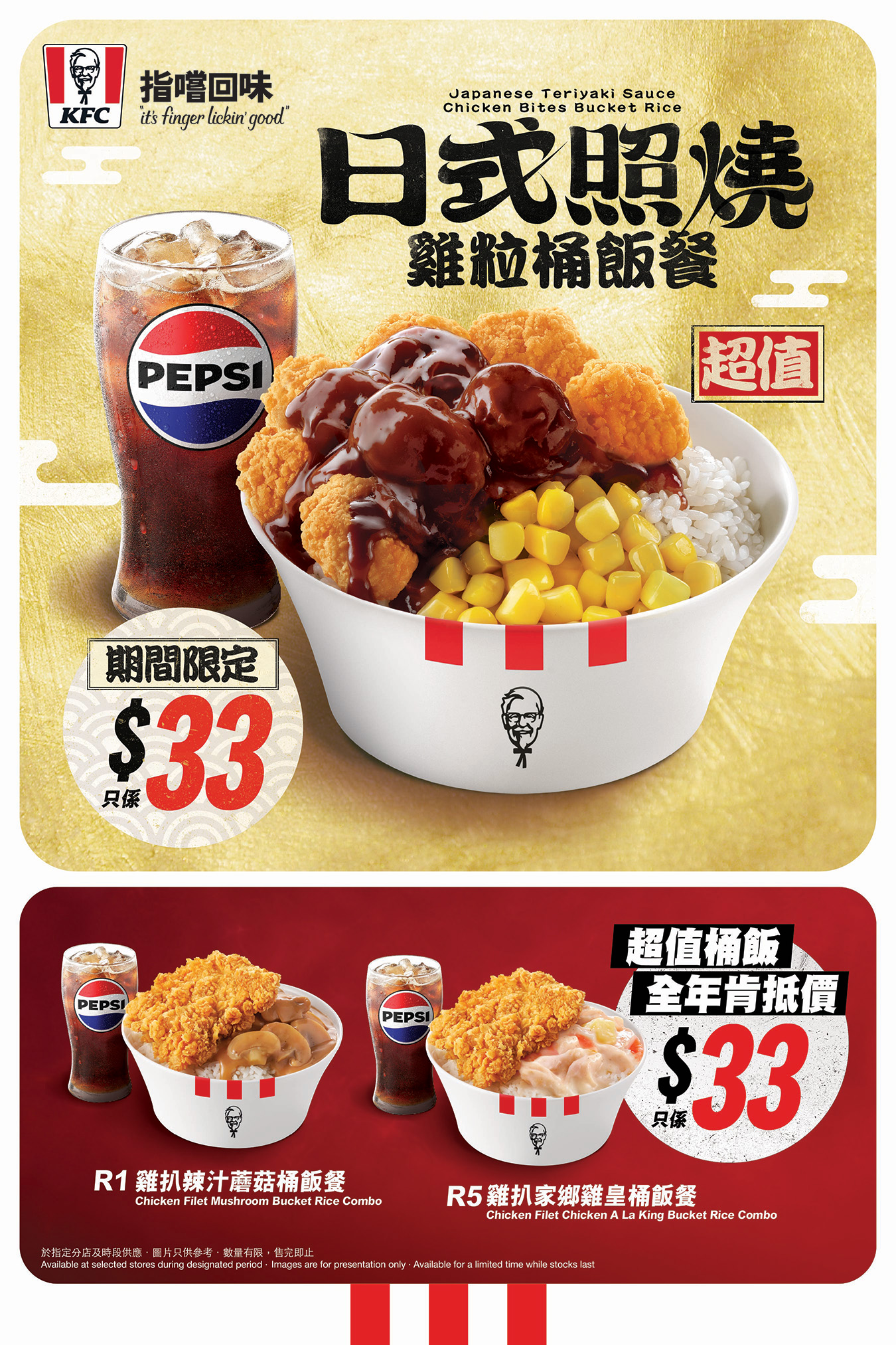 「肯!有飯氣」人氣桶飯系列一直是上班族同學生們的日常選擇,全年固定超值價,兩款經典桶飯連飲品只需$33,包括雞扒辣汁蘑菇桶飯餐(R1)及雞扒家鄉雞皇桶飯餐(R5)。今次全新「日式照燒雞粒桶飯餐」同樣以超值價$33登場,份量十足、食得抵又滿足!