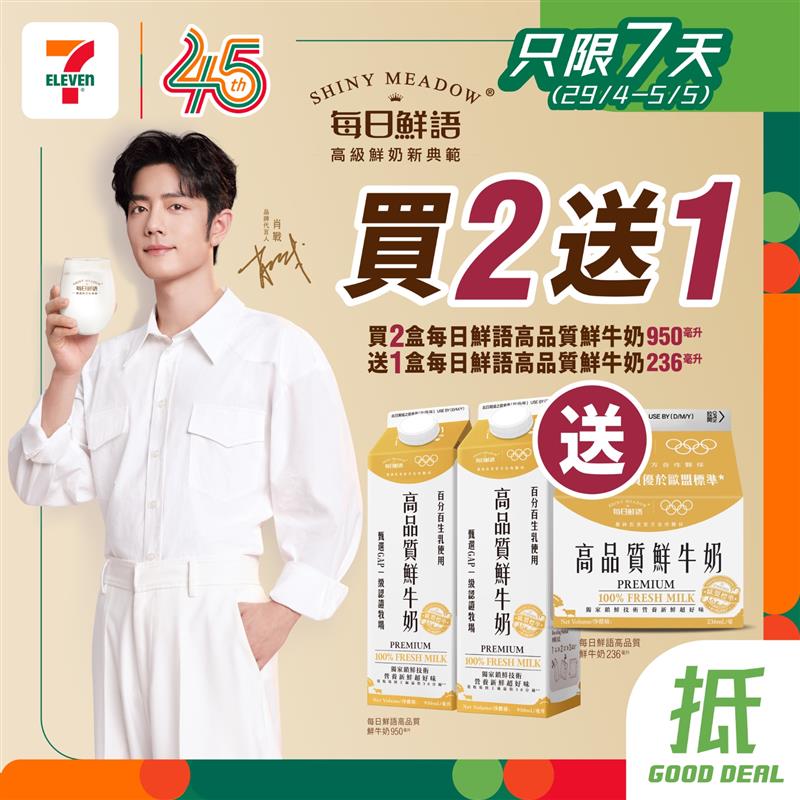 由即日起至5月5日嚟 7 仔買每日鮮語高品質鮮牛奶950毫升2盒,即送每日鮮語高品質鮮牛奶236毫升1盒*!