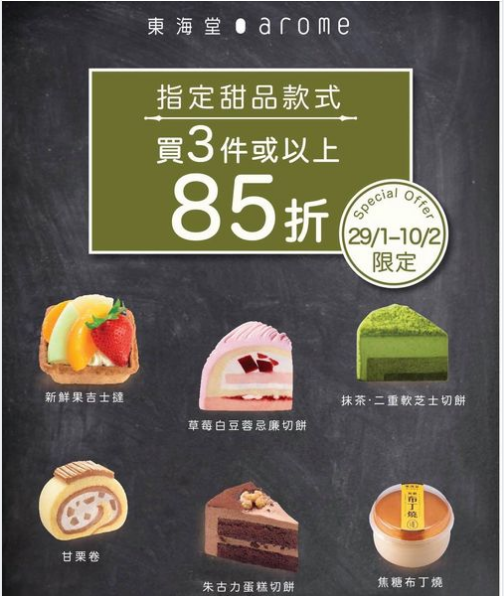 由即日起至2月10日,指定甜品款式任選3件或以上即享85折優惠。