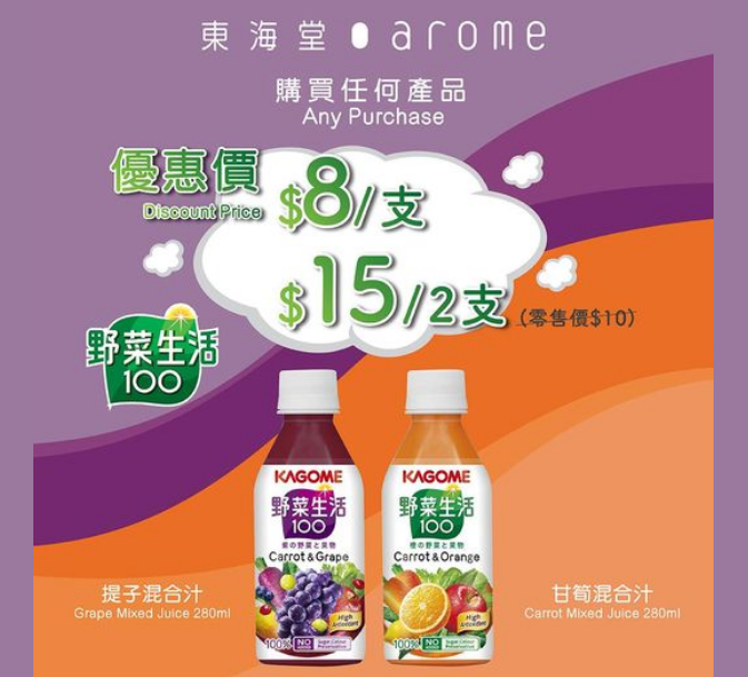 由即日起於全線分店購買任何產品,可以優惠價$15/2支 或 $8/支購買由日本直送野菜生活甘荀及提子混合汁(零售價$10) 。