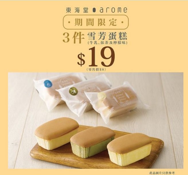 東海堂推出限定優惠:由即日起至8月6日,可以優惠價$19購買任何3件雪芳蛋糕(零售價$8) *。產品數量有限,趕快到東海堂分店選購。