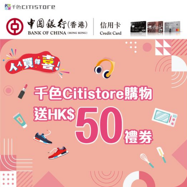 千色店【中銀信用卡 送千色Citistore禮券】,激拼購物日期間以中銀信用卡 / BoC Pay購物淨值滿HK$1,200*或以中銀恒地會Visa卡購物淨值滿HK$1,000*,即可獲贈千色CitistoreHK$50購物禮券一張。