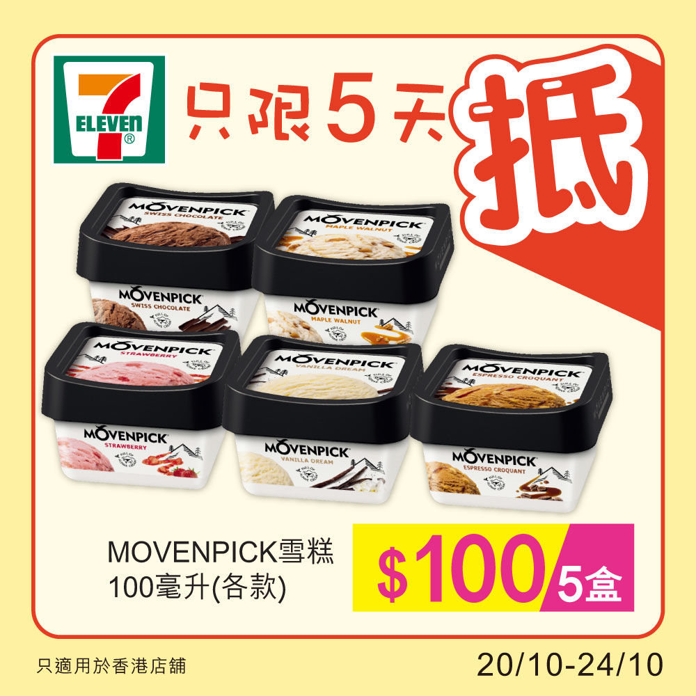 今個星期天氣終於開始轉涼,但無論咩天氣都冇阻想食雪糕嘅心!即日起至10月24日,於7-Eleven買各款MOVENPICK雪糕100亳升 $100 5盒,6 款口味選擇,包括雲呢拿、瑞士朱古力、特濃咖啡、士多啤梨、意大利奶凍同楓糖合桃,多種口味任你配搭!