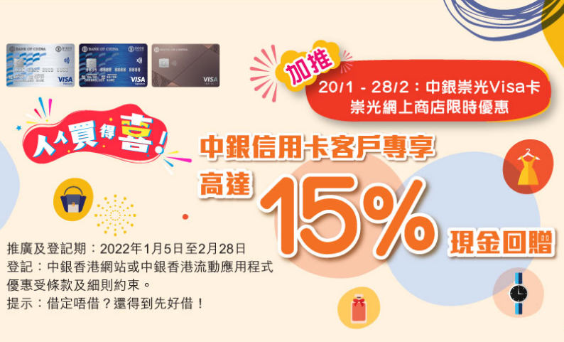 由1月20日至2月28日,憑中銀崇光Visa卡於崇光網上商店簽賬可享額外10%現金回贈,優惠可與上述「累積簽賬賞」同時享用,共享高達15%現金回贈!