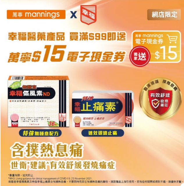 【網店限定】精選幸福醫藥產品買滿$99即送萬寧$15電子現金