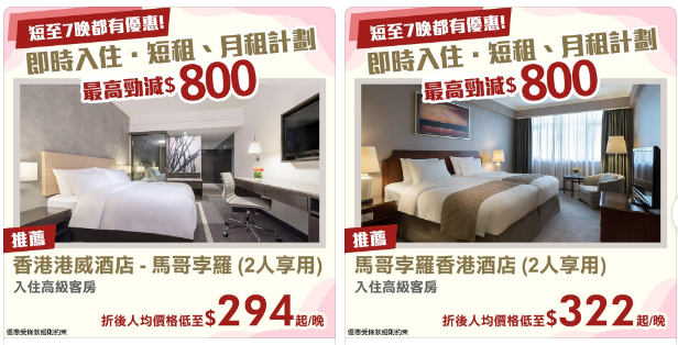 預訂指定香港酒店滿 29 晚或以上即減 $800;或