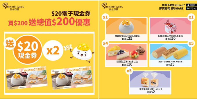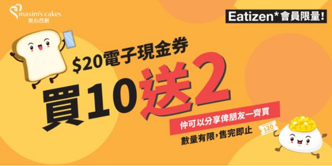 送總值$200驚喜優惠】而家透過Eatizen手機應用程式購買【美心西餅$200電子現金券套裝】,每套套裝均可額外獲得以下