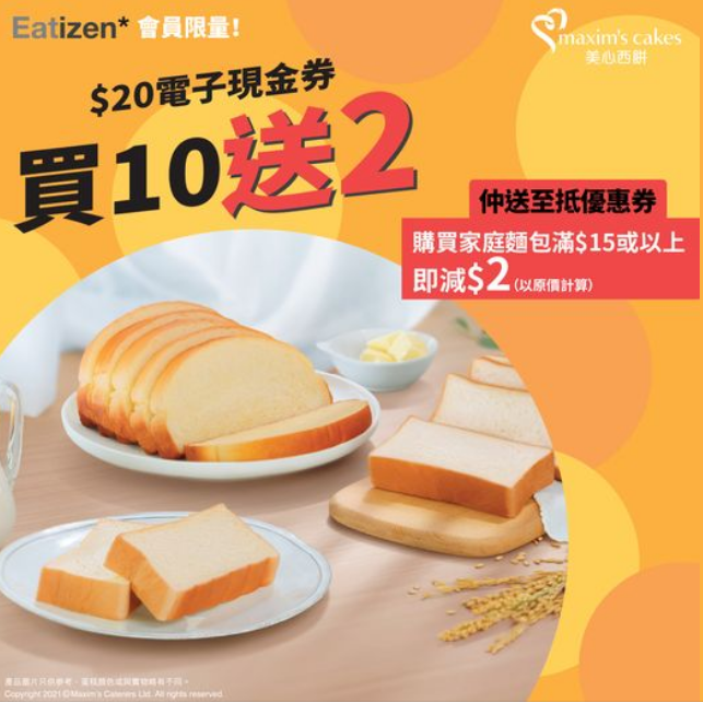 買家庭麵包即減$2】現凡透過Eatizen手機應用程式購買【美心西餅x Eatizen $200電子現金券套裝】