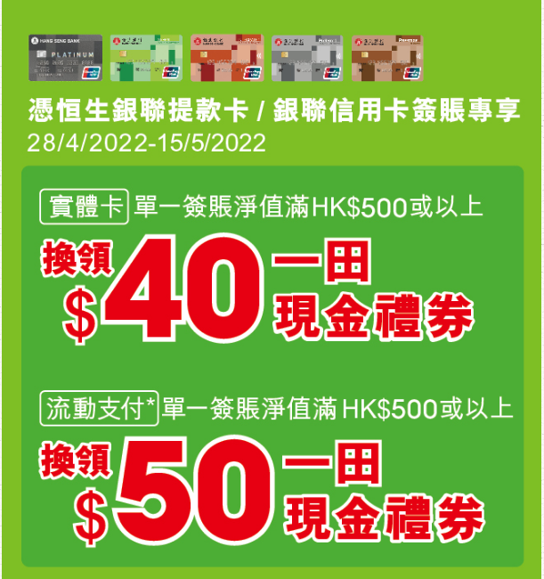 推廣期間,於全線一田憑恒生銀聯提款卡/銀聯信用卡即日單一簽賬滿HK$500或以上,即可換領高達HK$50一田現金禮券。每日數量有限,先到先得,換完即止。每位持卡人於每次簽賬最多只可換領現金禮券乙張。