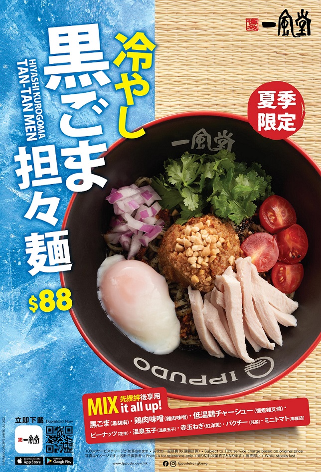 「黑胡麻擔擔冷麵」,以冷拉麵為大家於盛夏帶來一抹清風!黑胡麻汁由清雞湯混和黑胡麻醬而成,爽口彈牙的冷拉麵,慢煮雞肉叉燒及原隻鹽味半熟蛋,加上紅洋蔥、車厘茄、芫茜及香脆的花生碎等,是夏天不容錯過的拉麵首選!