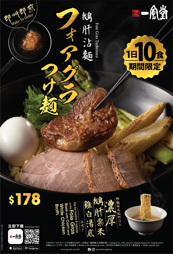 香港一風堂喜迎十一周年誌慶!為慶祝邁進十一周年的大日子,香港一風堂誠意推出全新周年限定「鵝肝沾麵」,以豪華食材—鵝肝為主角,加上一風堂引以為傲的雞白湯,以及精心配搭的配料,為你送上無可比擬的香濃沾麵享受!香港一風堂十一周年誌慶驚喜不斷,同步推出透心涼的「黑胡麻擔擔冷麵」為你一掃暑氣!