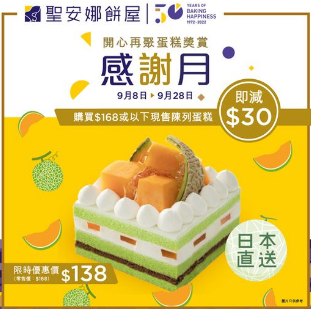 2. 優惠只適用於零售價$168或以下指定現售陳列蛋糕,產品數量有限,售完即止