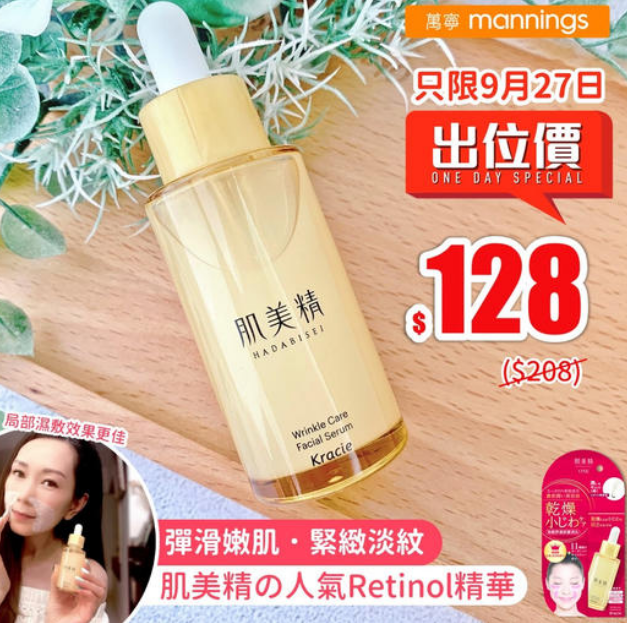 【萬寧9月27日出位價$128】想肌膚彈滑細嫩,【肌美精の人氣斷貨皇濃潤抗皺修復精華】幫到手。蘊含 #Retinol維他命A醇 、彈力蛋白及蜂皇漿等修護成分,有效促進膠原蛋白增生、減淡細紋,改善粗大毛孔及暗啞鬆弛肌膚,時刻彈潤透亮一瓶精華三大功效【水嫩保濕 x 緊緻淡紋 x 透亮彈滑】水潤質感極易吸收,補水嫩膚之選日本製造,無著色、無香料特別用法:將精華滴喺面膜紙上,並濕敷5-10分鐘,彈潤感UP-------------------------#萬寧9月27日出位價 #門市官網優惠同步肌美精 濃潤抗皺修復精華30毫升#9月27日出位價 $128 ($208)所有價格以店舖為準。如有爭議,萬寧保留最終之決定權。