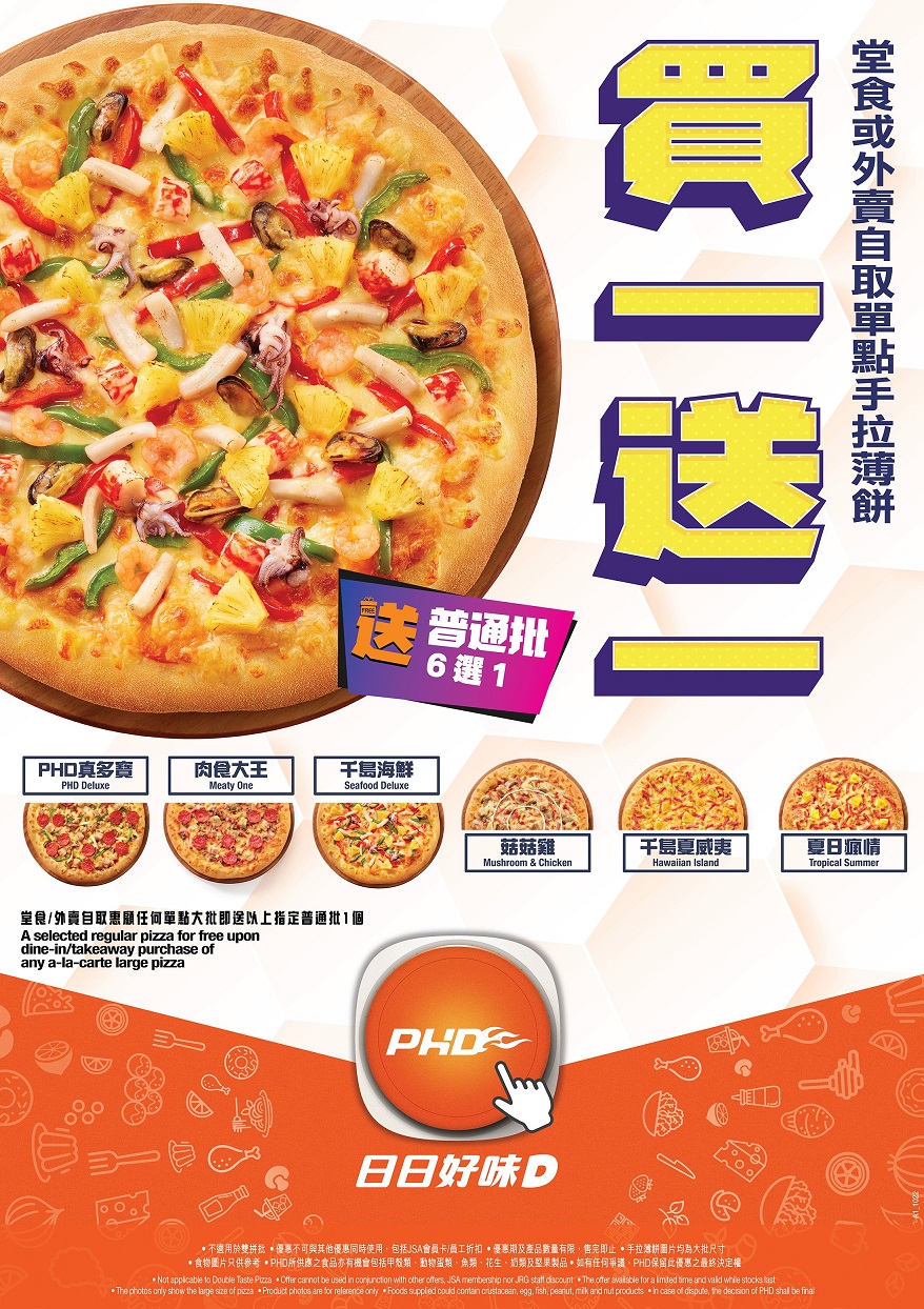人氣Pizza都可以買一送一?!無錯,手拉薄餅專門店PHD推出令人難以置信的限時震撼優惠,以買一送一的超值推廣「旋風式」橫掃香港!由即日起至10月31日,凡於PHD堂食或外賣自取惠顧任何單點大批,即可免費獲贈指定普通批一個,折後最多慳足$112!PHD更精選6款人氣滋味款式供選擇,星期一至日全天候適用,破天荒優惠絕對不!容!錯!過!PHD為大家精選6款大熱門手拉薄餅分別為菇菇雞、千島夏威夷、夏日瘋情、PHD真多寶、肉食大王及千島海鮮,配搭豐富配料及醬汁,入口滋味不斷,款款經典,部份更是長居銷量榜的人氣王!每款手拉薄餅予人截然不同的感覺,有大人小朋友最愛的千島夏威夷,亦有肉食狂迷必點的肉食大王,一次滿足所有願望和味蕾,將用餐氣氛推至高峰!