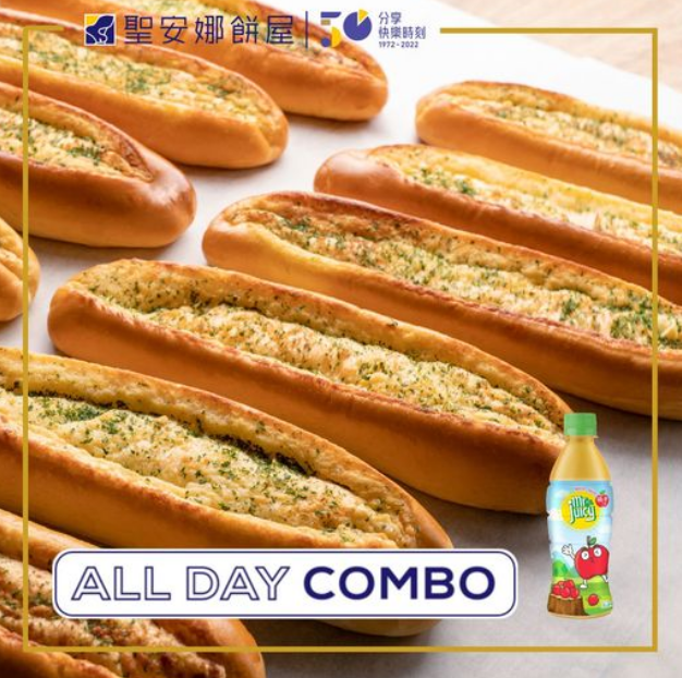 聖安娜餅屋 而家天氣開始轉涼, 食個新鮮出爐嘅香軟麵包感覺最幸福今期【ALL DAY COMBO】香蒜軟包配蘋果汁都只係$15! #聖安娜 #麵包每日新鮮製造 #麵包加入天然酵母 #更鬆軟好味 「ALL DAY COMBO」優惠條款及細則: 1.香蒜軟包(原價$10起)配雀巢咖啡香滑、香濃或美式醇黑(250毫升)一罐/果汁先生橙汁、蘋果汁(360毫升)一支優惠價$15。2. 優惠期由即日至2022年11月16日。3. 數量有限,售完即止,有關貨品供應狀況,請向店員查詢。4. 優惠不可與禮餅券、麵包現金券及其他優惠同時使用。5. 優惠只適用於聖安娜餅屋香港分店