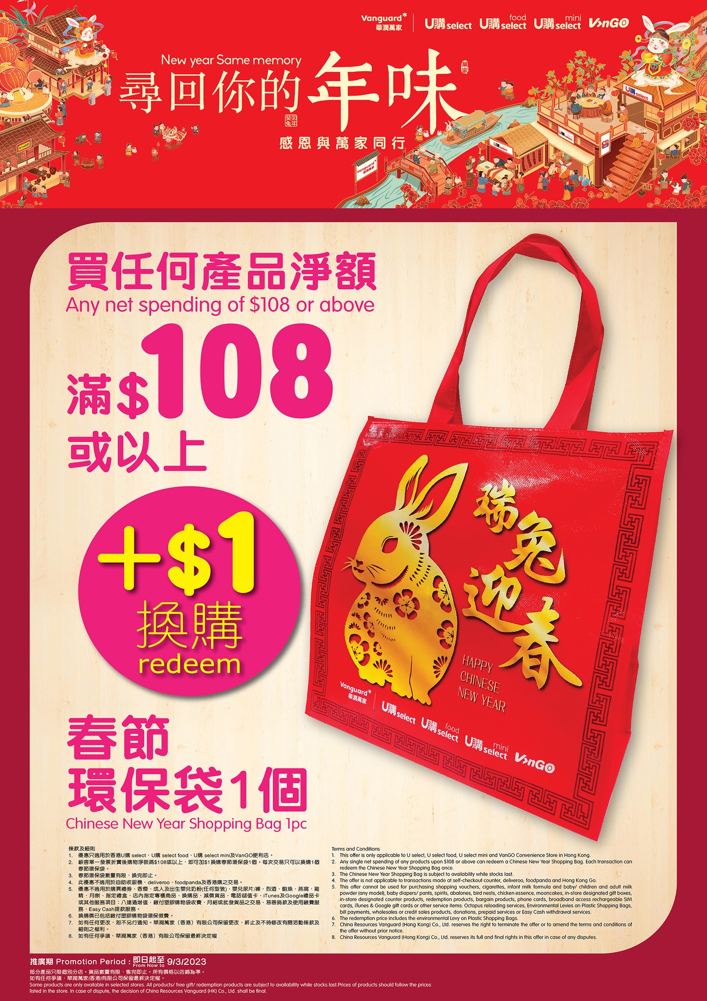 由即日起至2023年3月9日,嚟U購 select 同VanGO便利店買任何產品淨額滿$108或以上