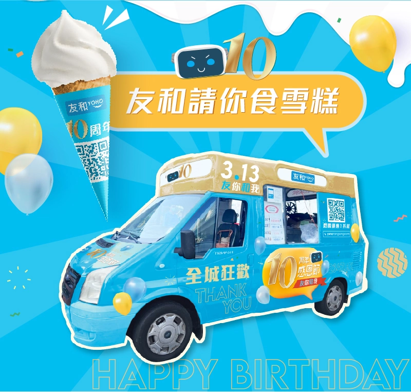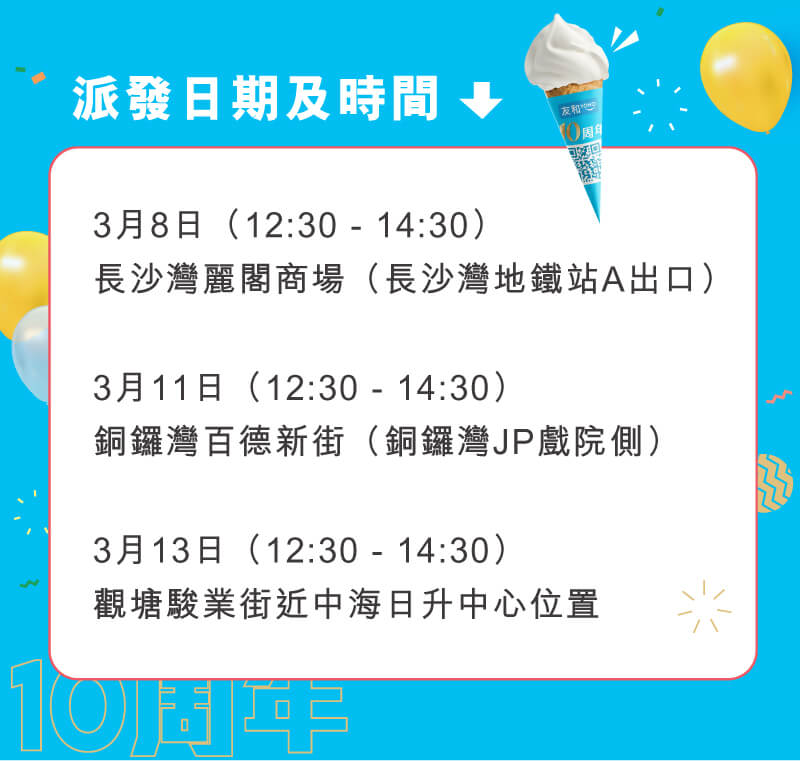 為咗多謝咁多年嚟各位友和YOHO會員嘅支持,我哋將會喺3月8日、11日同13日,喺長沙灣、銅鑼灣同觀塘3個地點免費派雪糕畀大家,將呢份喜悅同大家一齊分享!快啲同我哋一齊慶祝友和YOHO嘅10歲生日啦~~仲有,如果喺派雪糕當日即場消費滿HK$500,仲送你10周年友和YOHO小涼伴(價值HK$128),數量有限,額滿即止!