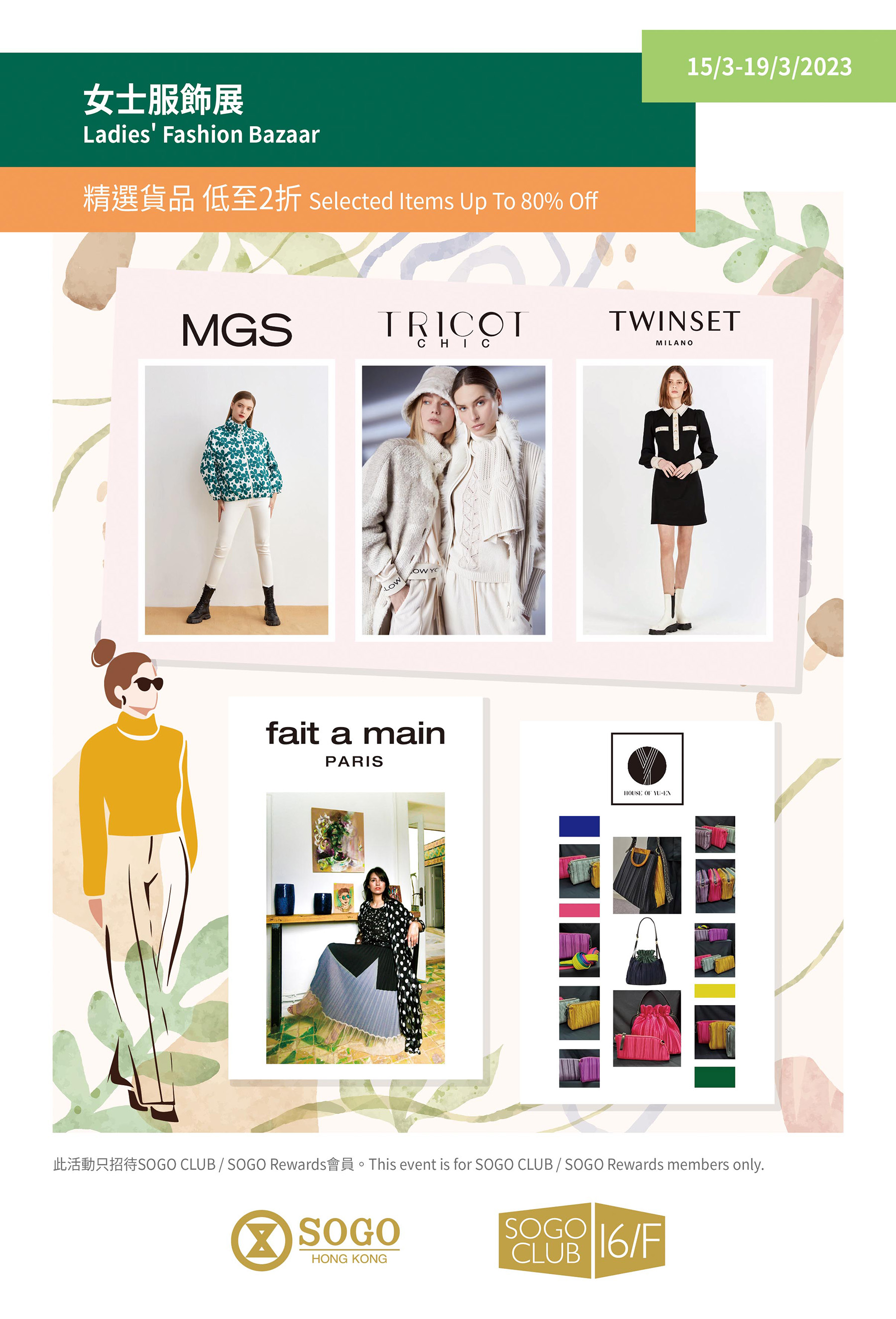 於15/3至19/3/2023期間,女士服飾展於崇光銅鑼灣店SOGO CLUB 16/F舉行。歡迎親臨精選貨品,尊享低至2折優惠。