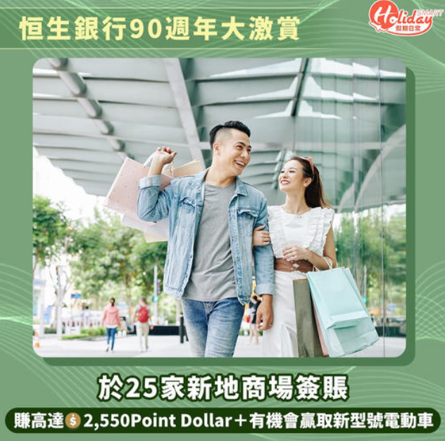 【恒生銀行90週年雙重激賞優惠】於25家新地商場簽賬即賺高達$2,550 Point Dollar,仲有機會贏取新型號電動車!即睇更多詳情
