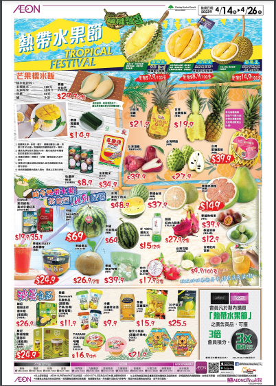 AEON Stores 熱帶水果節推廣日期: 2023年4月14日至4月26日https://www.aeonstores.com.hk/promotion/download?id=2383&q[id_eq]=2383&f=file_chk