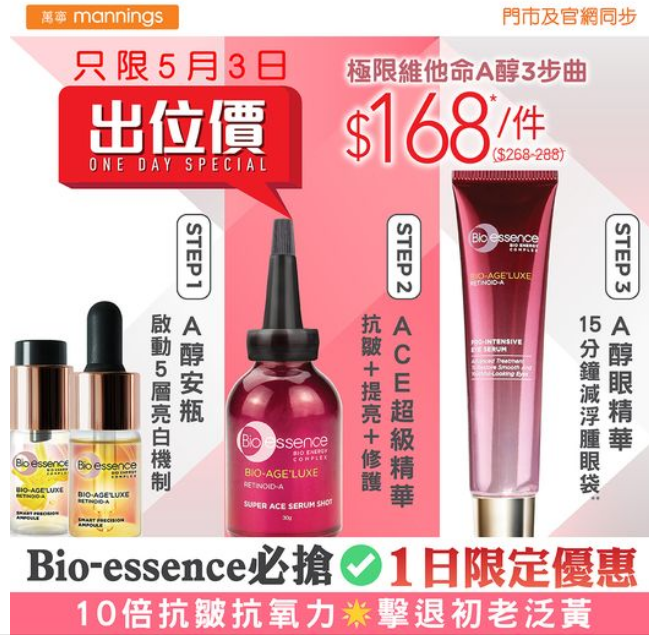 細紋、暗啞冇彈性、泛黃等等,就要試Bio-essence嘅Age’Luxe極限維他命A醇系列,比一般維他命A醇高效穩定10倍,仲唔會好似一般A醇咁用完刺激甩皮!5月3日,萬寧一日出位價優惠,只需$168/件*就可以入手