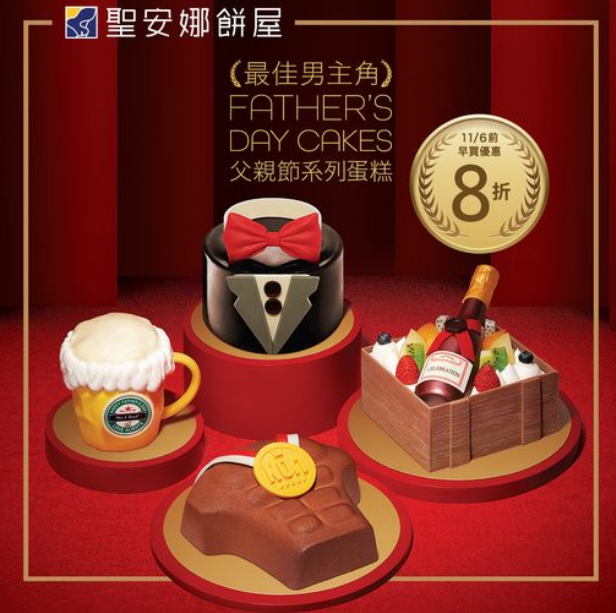 6月11日或之前隨時去聖安娜分店或網店購買父親節系列蛋糕都有8折,頒個獎比最勁嘅Daddy啦!