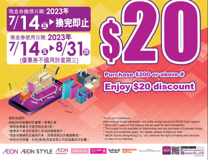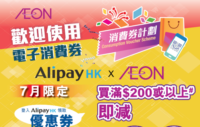 AEON Stores AlipayHK - 消費劵活動推廣日期: 2023年7月14日至8月31日https://www.aeonstores.com.hk/promotion/download?id=2486&q[id_eq]=2486&f=file_chk