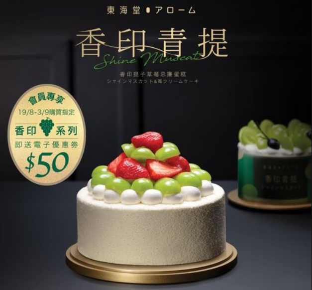 由即日起至9月3日,Arome App會員優先訂購香印青提系列指定蛋糕即送東海堂 アローム電子券$50一張*