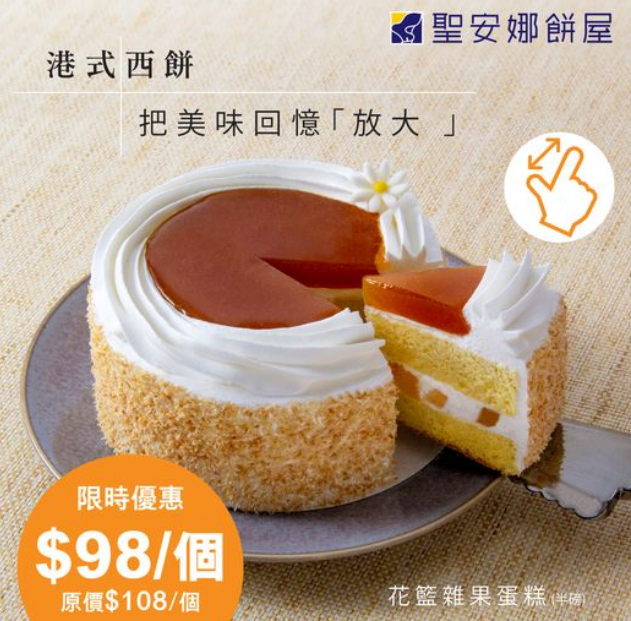 又可以同親朋好友一齊分享兼重溫美味回憶?優惠期內可以$98購買經典「花籃雜果蛋糕」,聖安娜全線分店都有得買,想回味一下昔日時光就係咁簡單