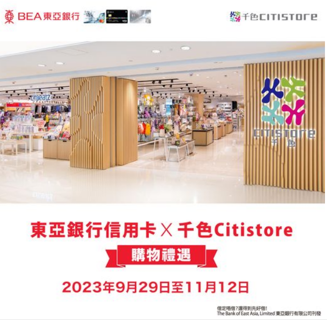 由9月29日至11月12日,憑東亞銀行信用卡於千色Citistore簽賬獲享精彩購物禮遇!