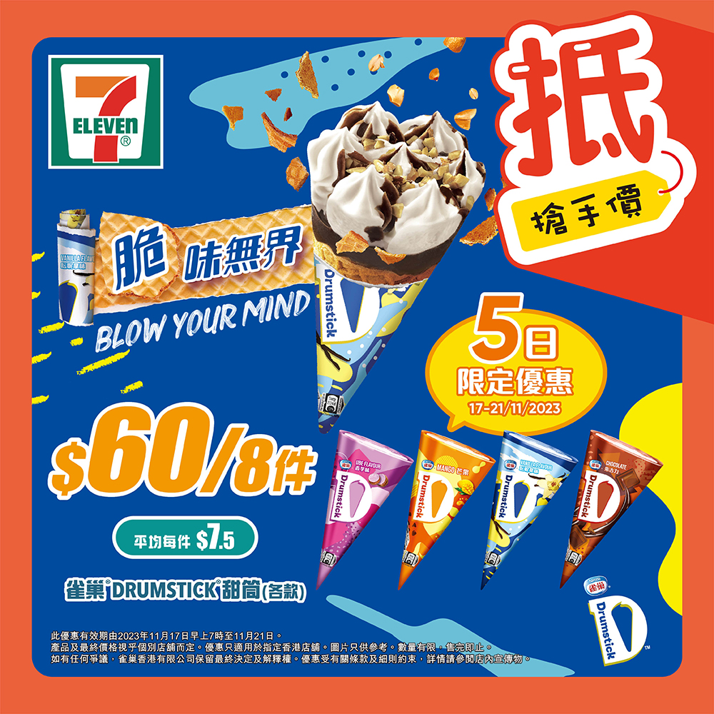 ✨優惠有效日期由2023年11月17日至11月21日。優惠只適用於香港店舖。部分貨品只限於指定店舖提供。貨品數量有限,售完即止。如有爭議,所有價格以個別店舖為準。貨品圖片只供參考。就一切有關事宜,7-Eleven將保留最終之決定權。
