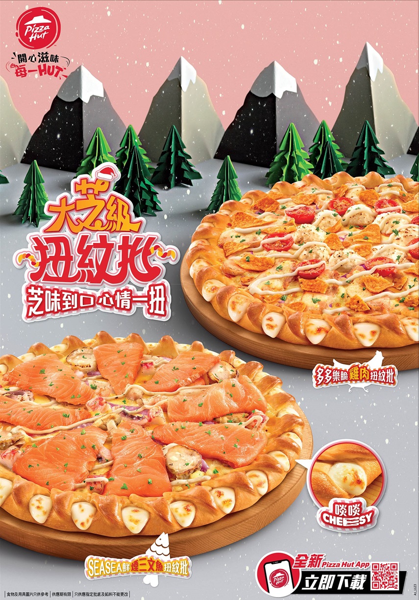 都市人生活繁忙,成日忙到氹氹轉,幸好有Pizza Hut時刻帶來開心滋味每一刻。作為派對必備的「大芝級扭紋批」,只要一出場,芝味到口,心情即刻一扭!Pizza Hut同時推出「扭轉驚喜套餐」,配精選意粉及滋味小食,適合2人、4人或8人享用,超值價低至港幣$280起,無論與摯愛甜蜜過聖誕,還是一眾親朋好友歡度佳節,輕鬆扭出歡樂「芝」味時光!主角「Sea Sea鮮煙三文魚扭紋批」和「多多樂脆雞肉扭紋批」分別為海鮮Fans和食肉獸精心設計。扭紋芝心批邊外脆內軟,無論配鮮味煙三文魚還是嫩滑雞肉,一扭隨即拉出濃郁拉絲芝士,盡享超豐富配料帶來的多重口感,逐漸變開心又得,立即變開心亦得,得咗!
