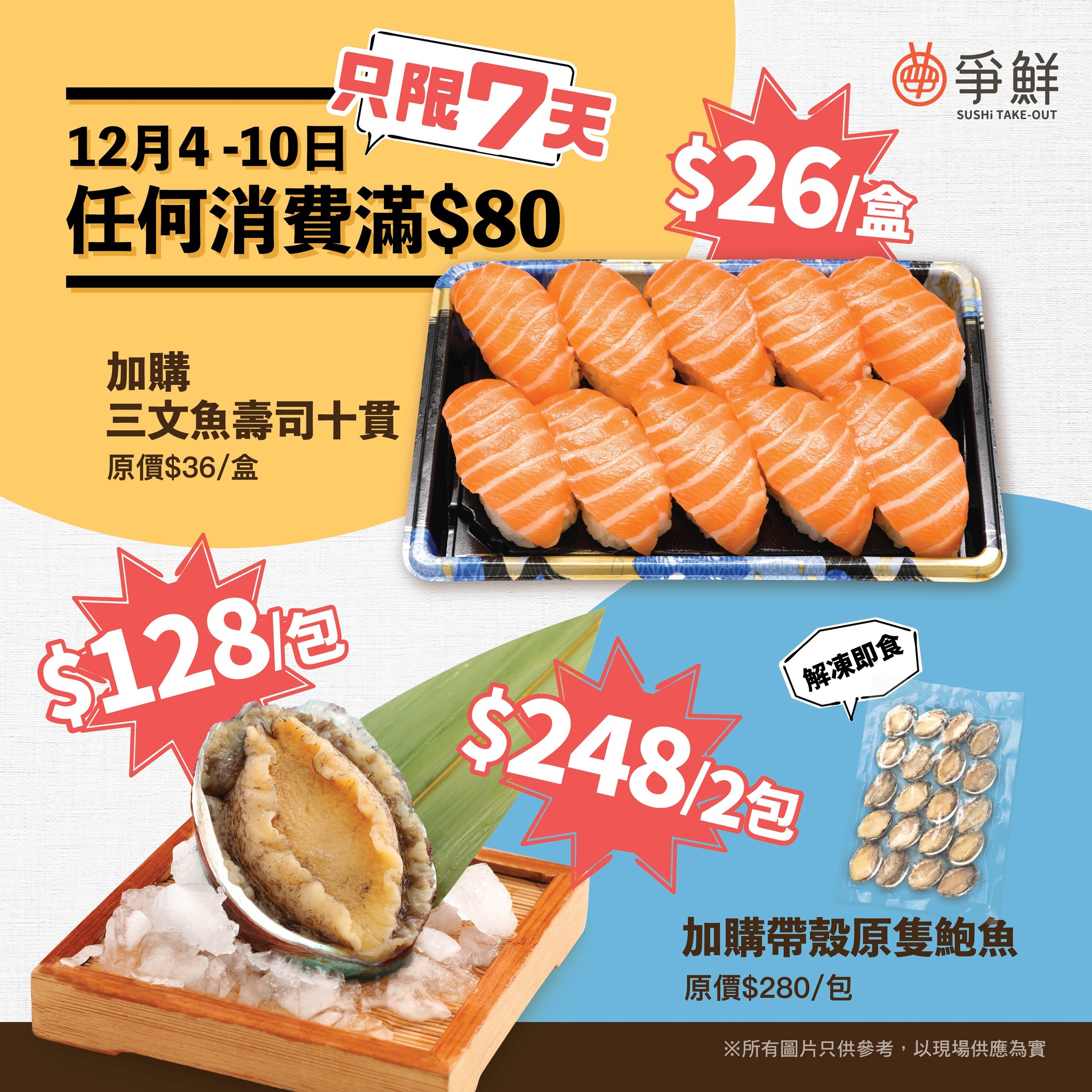 12月4日至10日期間(📅只限7天),於 #爭鮮外帶 消費滿$80,可以$26換購 #挪威直送 三文魚壽司十貫1盒;另外,任何消費均可以✨換購價$128✨加購帶殻原隻鮑魚1包,想要兩包?Okay👌✨$248/2包✨!!!