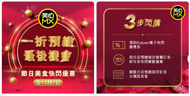 優惠已經進入倒數7日啦,記得登入Eatizen領取 #快閃預訂優惠!*需於取貨最少3日、下午3點前,前往取貨分店繳付尾數,方可享有快閃優惠價。