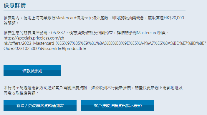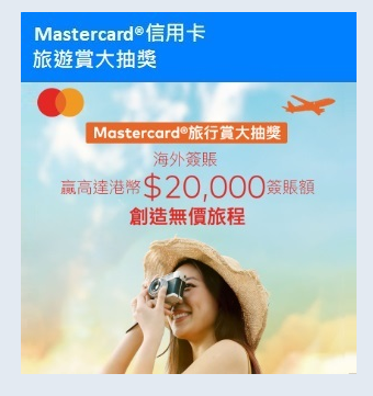 推廣期內,使用上海商業銀行Mastercard信用卡在海外簽賬,即可獲取抽獎機會,贏取高達HK$20,000簽賬額。
