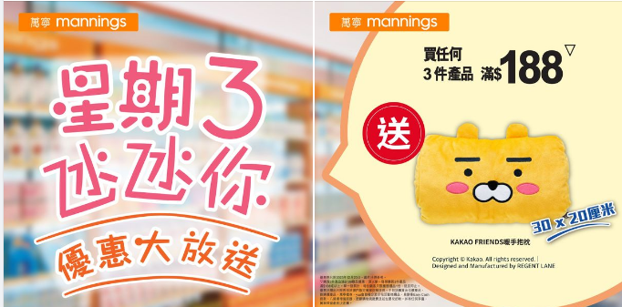 萬寧官方網店購物優惠由上午6時至晚上11時59分,數量有限,送/售完即止。部份產品/優惠不適用於澳門分店/萬寧官方網店/yuu網購萬寧頁面及Market Place by Jasons 手機應用程式萬寧頁面,優惠受條款及細則約束, 詳情請參閱 www.mannings.com.hk 。