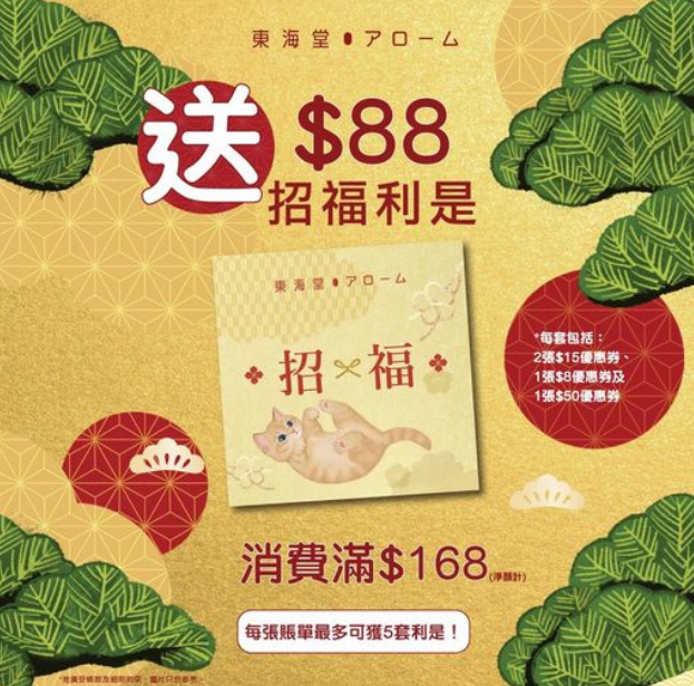【 開運招福!為您派發喜悅】招福招福!即日起於東海堂 アローム購買任何產品消費滿折實價$168*,即送$88「招福利是」優惠券#,多買多送。配色時尚且引人注目的招財貓貓下,祝願各位邁向美好豐盛新一年,立即蒞臨門店盡享快樂購物的新春佳節吧!*以淨金額及單一發票計算。優惠券包括:2張$15 優惠券、1張$8優惠券及1張$50優惠券!^每張帳單最多可獲 5 套利是此優惠只適用於分店現售及取餅,不適用於網上訂購及付款。不包括購買東海堂禮餅券及八達通增值。推廣受條款及細則約束。圖片只供參考。東海堂有限公司保留此優惠之最終決定權。