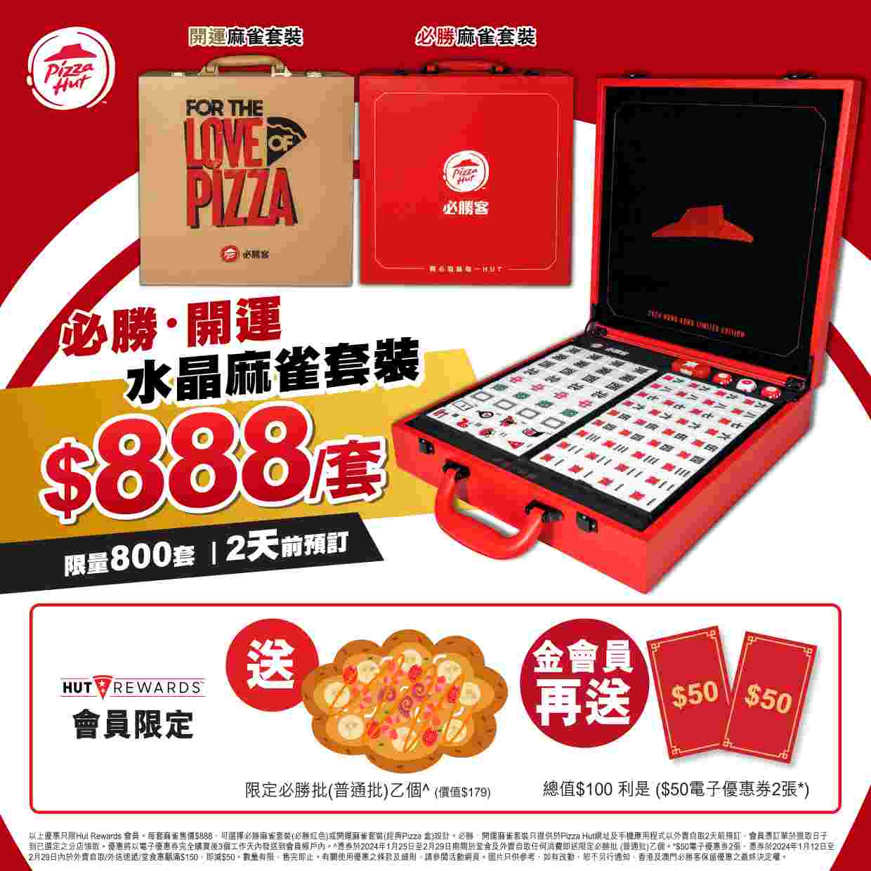 今個新年與親朋好友圍爐打牌時必備致勝法寶!Pizza Hut隆重呈獻全新「2024限量版必勝 · 開運水晶麻雀」,限量800套,送禮自用皆宜。由 1月12日起,Hut Rewards會員可透過Pizza Hut網站或手機應用程式預先兩日下單並到分店取貨。兩個套裝款式包括「必勝麻雀」及「開運麻雀」,以人造皮革製作的包裝盒分別以應節的必勝紅色和經典Pizza盒造型設計,加上別具質感的自家設計水晶麻雀,體現Pizza Hut的玩味風格,極具收藏價值!至於非會員只須下載Pizza Hut手機應用程式並登記成為會員即可即時下單。