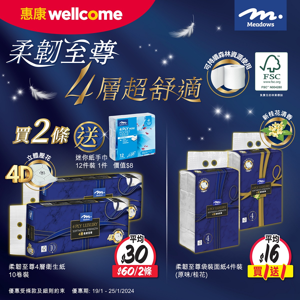 ;而衛生紙就有4D立體印花,等你隨時Refresh~依家嚟惠康以$60就可以買到2條Meadows柔韌至尊4層衛生紙10卷裝,仲送Meadows迷你紙手巾12件裝1件;Meadows柔韌至尊4層袋裝面紙每件$32,買1送1,平均$16,等你同屋企人都有至尊級享受!