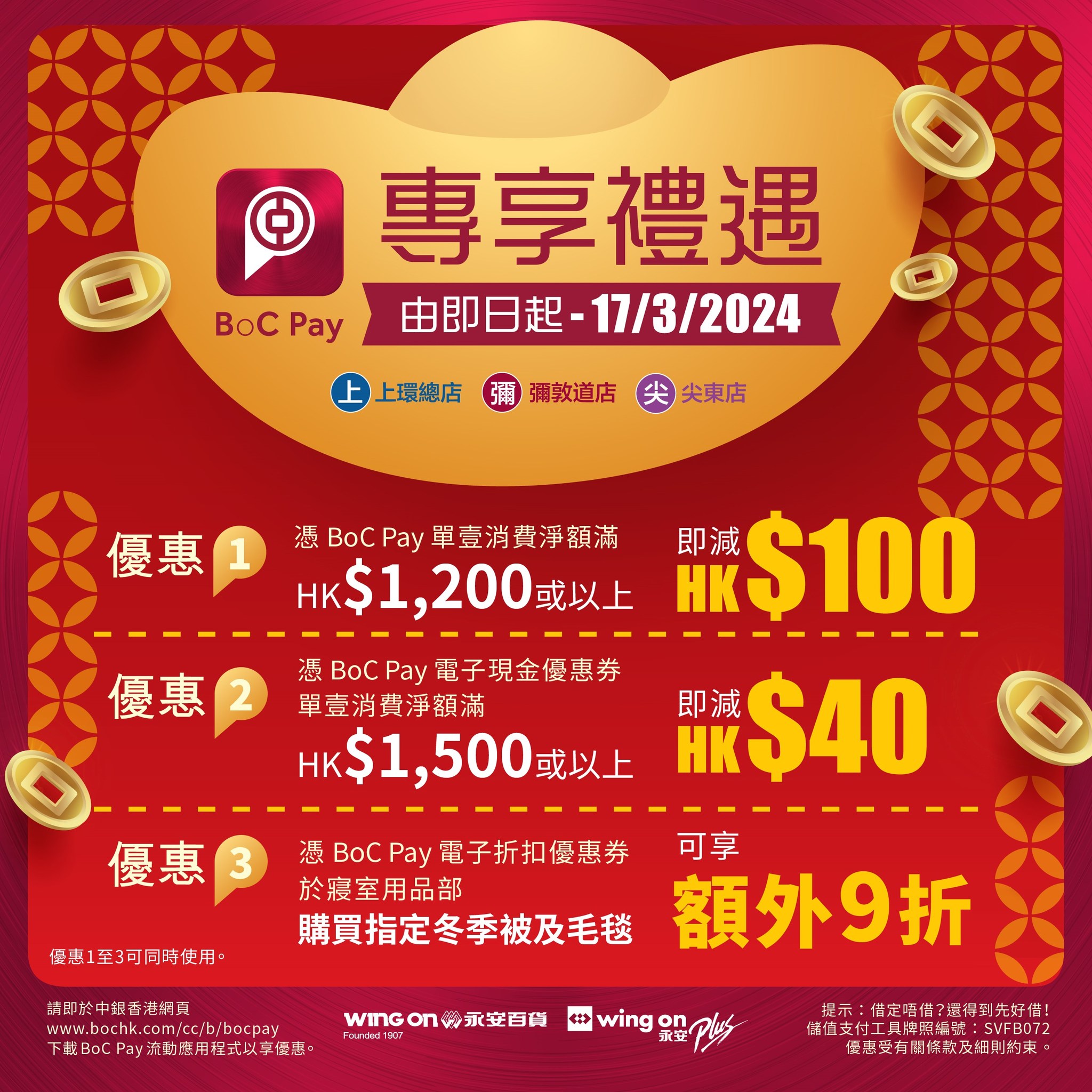 憑 BoC Pay 電子現金優惠券,單壹消費淨額滿HK$1,500(印花換購貨品、指定專櫃及寄銷貨品除外),即減HK$40