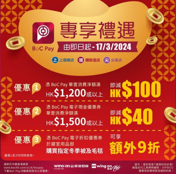憑BoC Pay電子現金優惠券,單壹消費淨額滿HK$1,500(換印花購貨品、指定專櫃及寄銷貨品同類),即減HK$40優惠