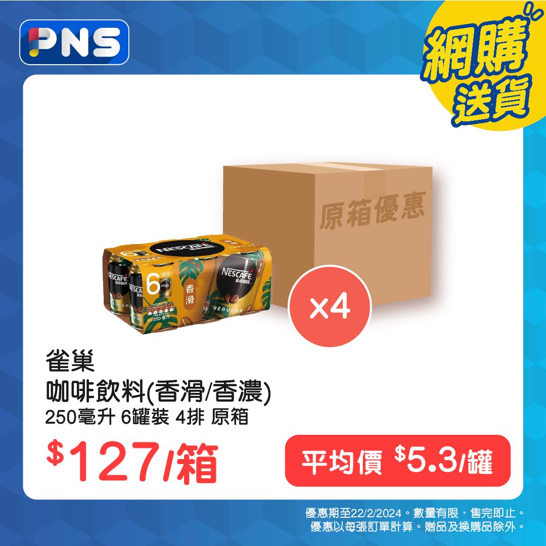 雀巢原箱香滑咖啡250毫升6罐裝4排,優惠價$127/箱,平均價$5.3/罐