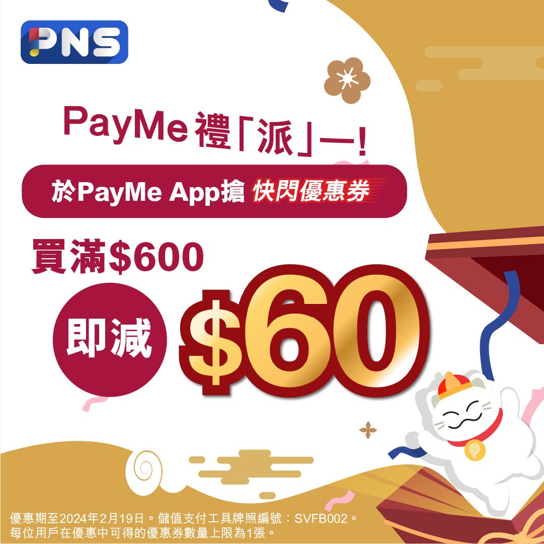 先於PayMe App「優惠券」專區搶券,再於PNS網購買滿$600送貨訂單,即減$60 (優惠券自動扣減#)