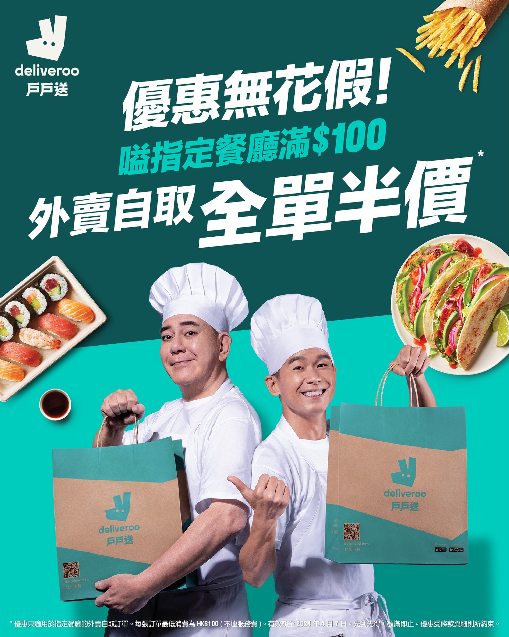 *優惠只適用於指定餐廳的外賣自取訂單。每張訂單最低消費為HK$100 (不連服務費)。有效期至2024年4月7日。每張訂單優惠詳情、優惠上限、有效日期及最低消費視乎品牌而異。先到先得,額滿即止。優惠受條款與細則所約束。