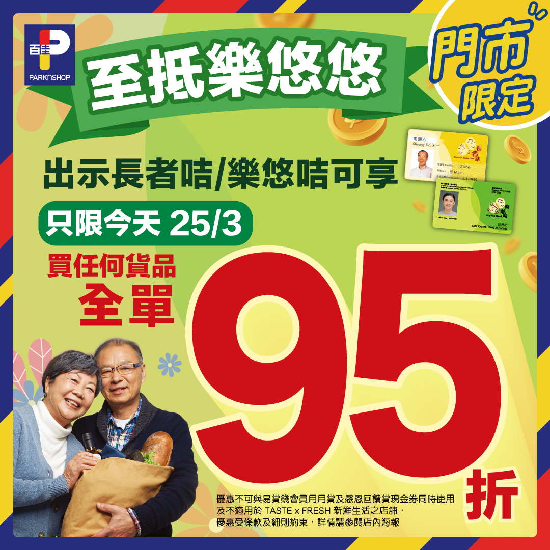百佳 出示長者咭/樂悠咭,買任何貨品全單95折