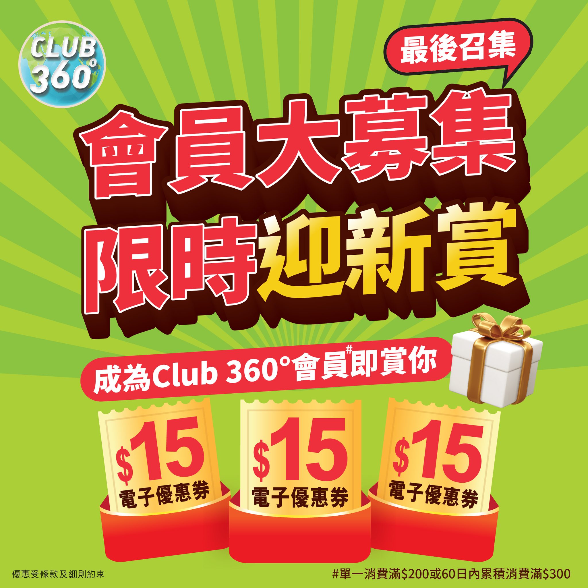 新會員大募集!你 Join 我賞,於 3 月 1 - 31 日期間單一消費滿 $200 或 60 日內累積消費滿 $300 即成功升級成為 CLUB 360 普通會員,兼享 3 張 $15 電子優惠券!