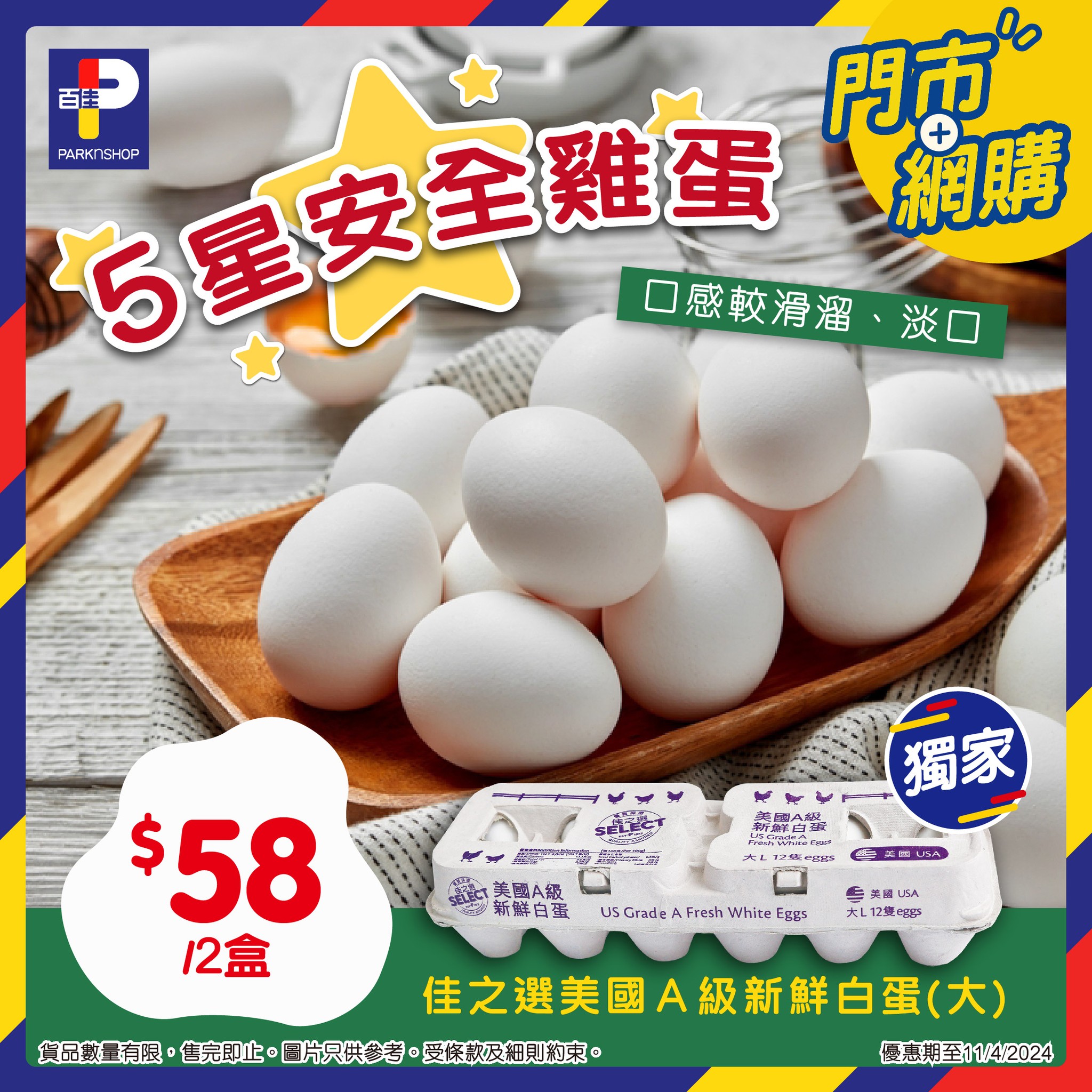 佳之選美國A級新鮮白蛋(大) $58/2盒*優惠期至11/4/2024。以上優惠適用於大部分香港百佳、TASTE、FUSION、INTERNATIONAL及PNS網購有售,並不適用於百佳旗下的其他超市品牌、 EMax(九展)、數碼港商場3樓及新鮮食品優惠並不適用於TASTE x FRESH新鮮生活之店舖。贈品/換購品除外。貨品/贈品/換購品數量有限,售/送/換完即止。圖片只供參考。以每張發票計算,並只可享用個別優惠一次。
