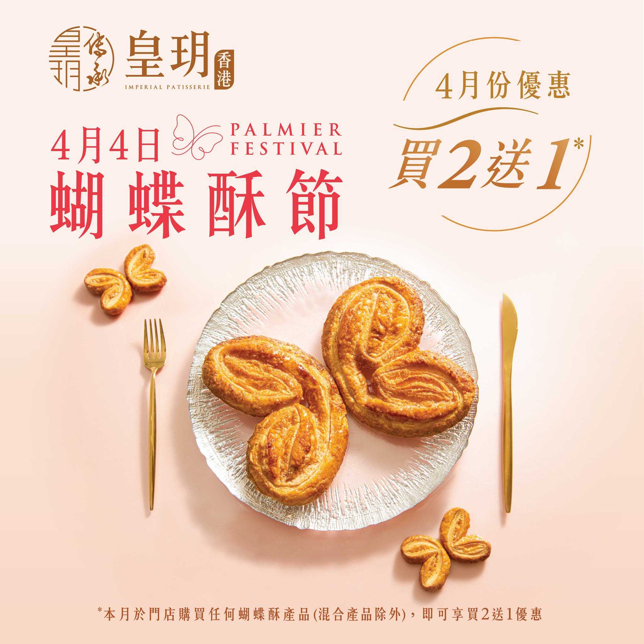 - 凡於4月份於皇玥及明玥門店購買蝴蝶酥產品,即可享買二送一優惠(*不包括混合餅食產品)。